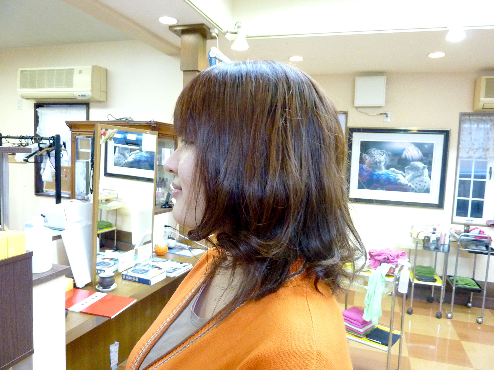 今回は、色味を暗くして長さ(傷んでいる毛先を含め)も短くしました。