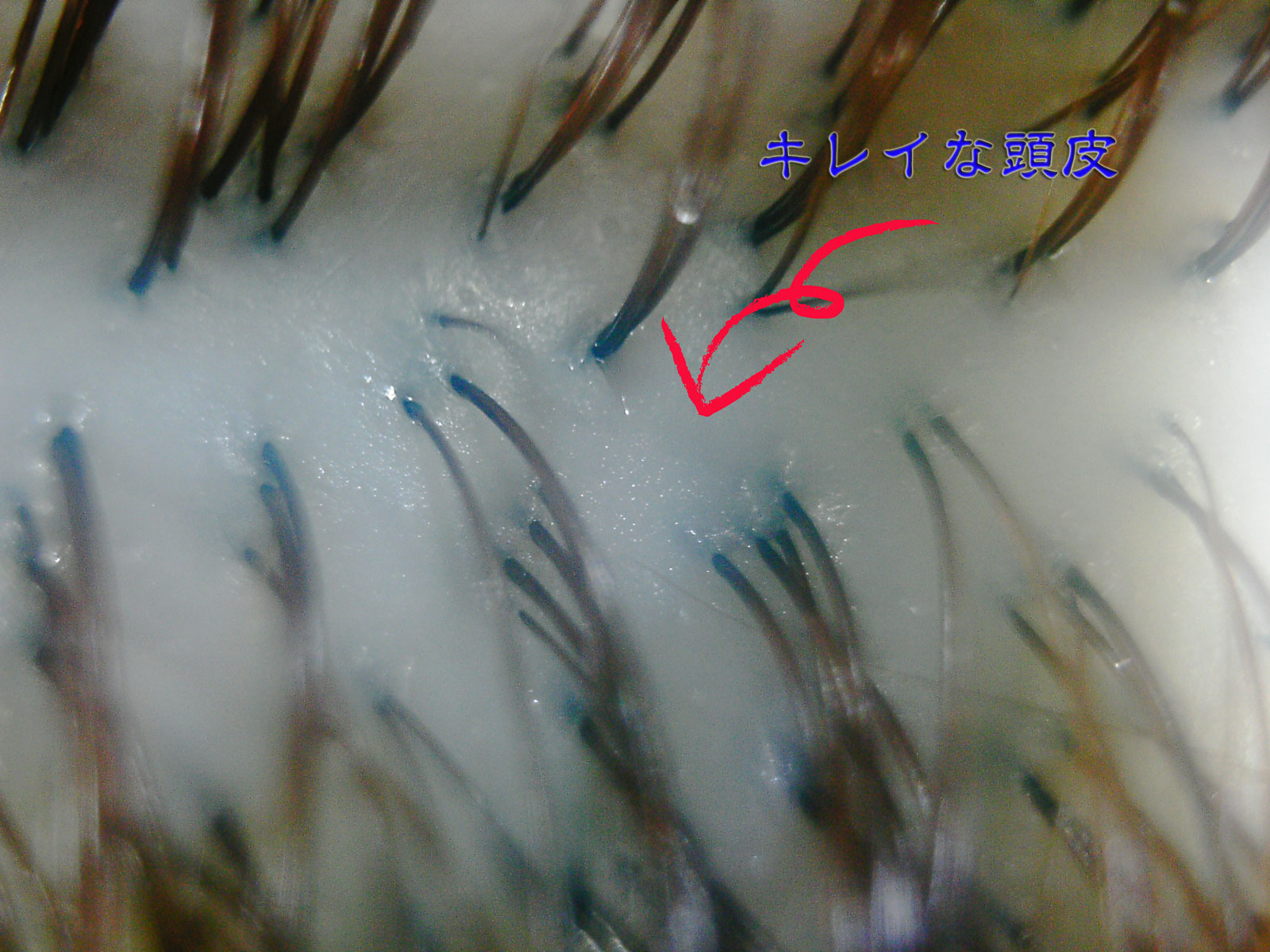 こちらは、すこし曇っていて見づらいかもしれませんが、頭皮も透き通った白で、毛穴の周りもほどよく水分がたまっていますよね?非常に良い状態です!