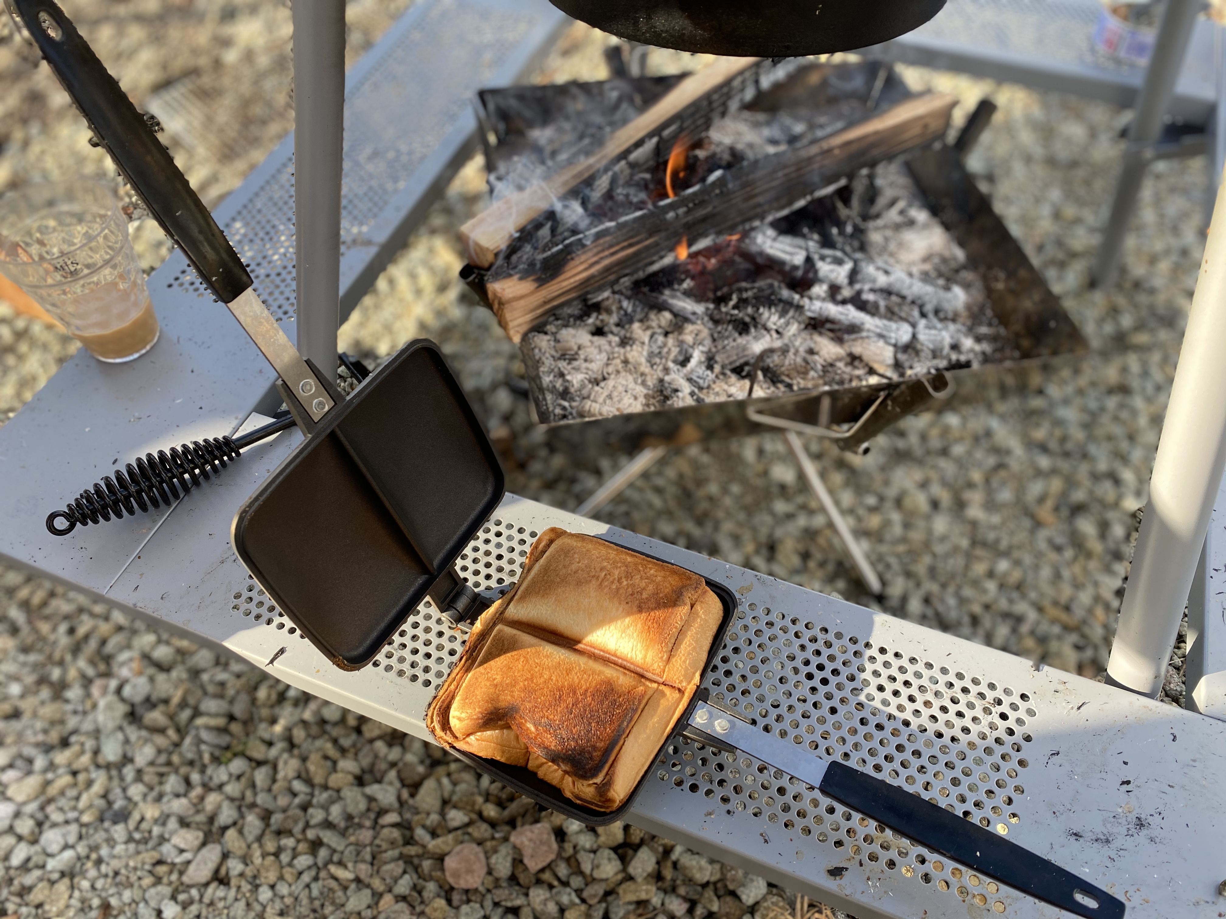 起きてから、再度焚火をつけてホットサンドを作って食べました。